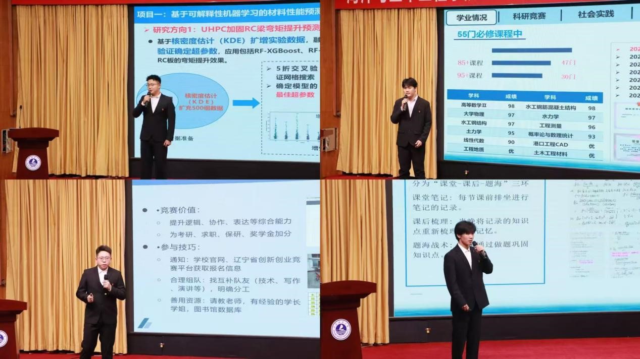 宣讲环节中,宣讲团成员代表依次登台,结合自身成长经历与学习感悟进行了精彩分享。成员包括连续两年荣获国家奖学金并已推免至浙江大学的2022级学生徐伟东、获得国家奖学金及全国大学生水利创新设计大赛二等奖并推免至华南理工大学的2022级学生陆宏伟、荣获国家奖学金及全国大学生先进成图技术与产品信息建模创新大赛三等奖的2023级学生张国瑞,以及获得全国大学生数学竞赛国家三等奖和连续两年获得辽宁省政府奖学金的2023级学生吴志钊。他们结合自己的大学经历,将成长与奋斗故事娓娓道来,在展示个人风采的同时,也给予现场听众大学学习的方法与方向,现场气氛热烈,掌声此起彼伏。