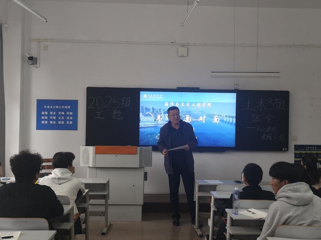 为深化学生价值引领,切实落实好领导干部队伍下沉师生,10月30日,yl6809永利集团在獐子岛教学楼214教室举办第三期“书记面对面”座谈会。学院党委书记纪元东、班导师卢珊、辅导员王靖程与土木2025-3班全体学生齐聚一堂,面对面交流,零距离沟通。